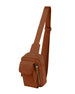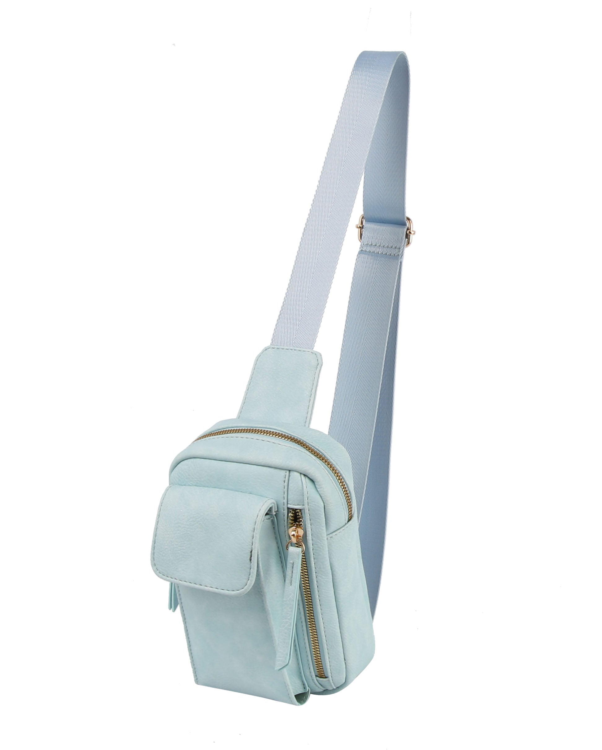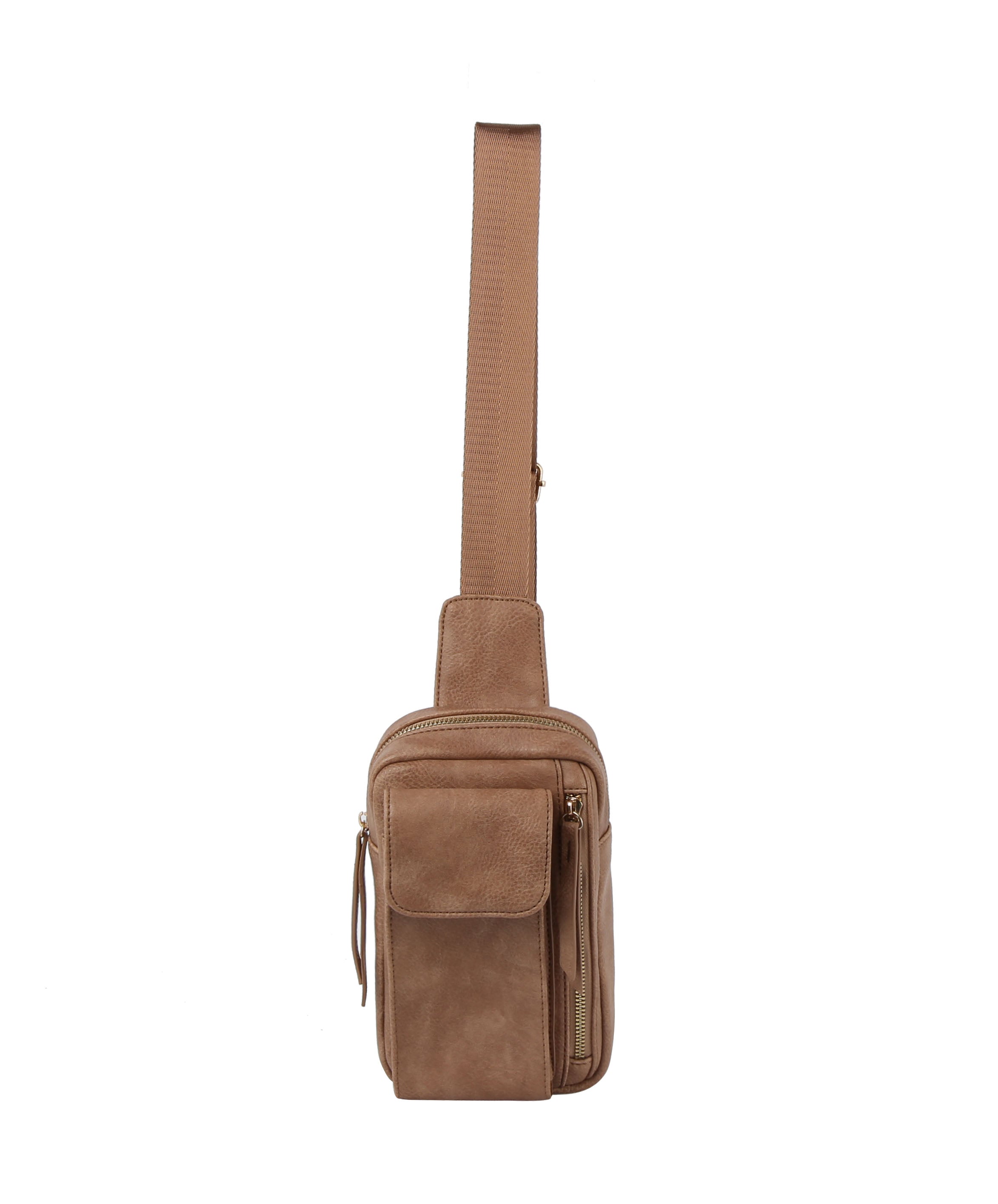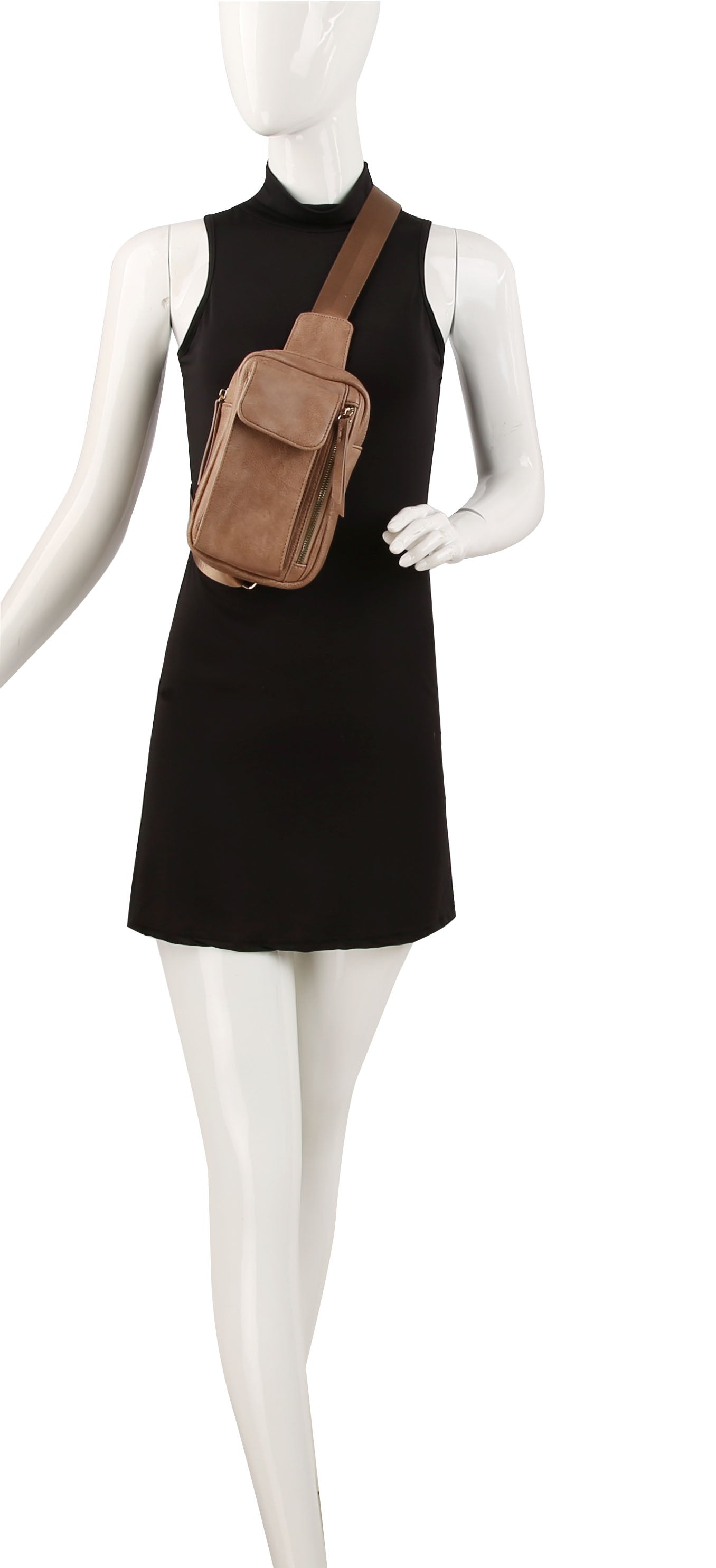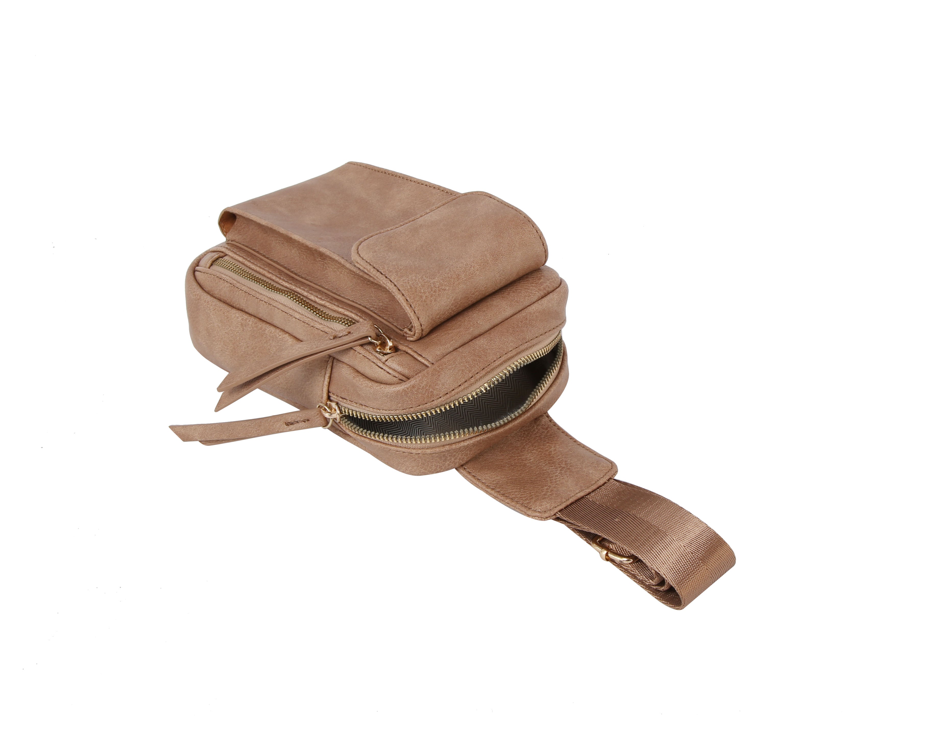 1 front zip and front flap pocket. Single adjustable strap. Faux leather with lined interior. Gold toned...
