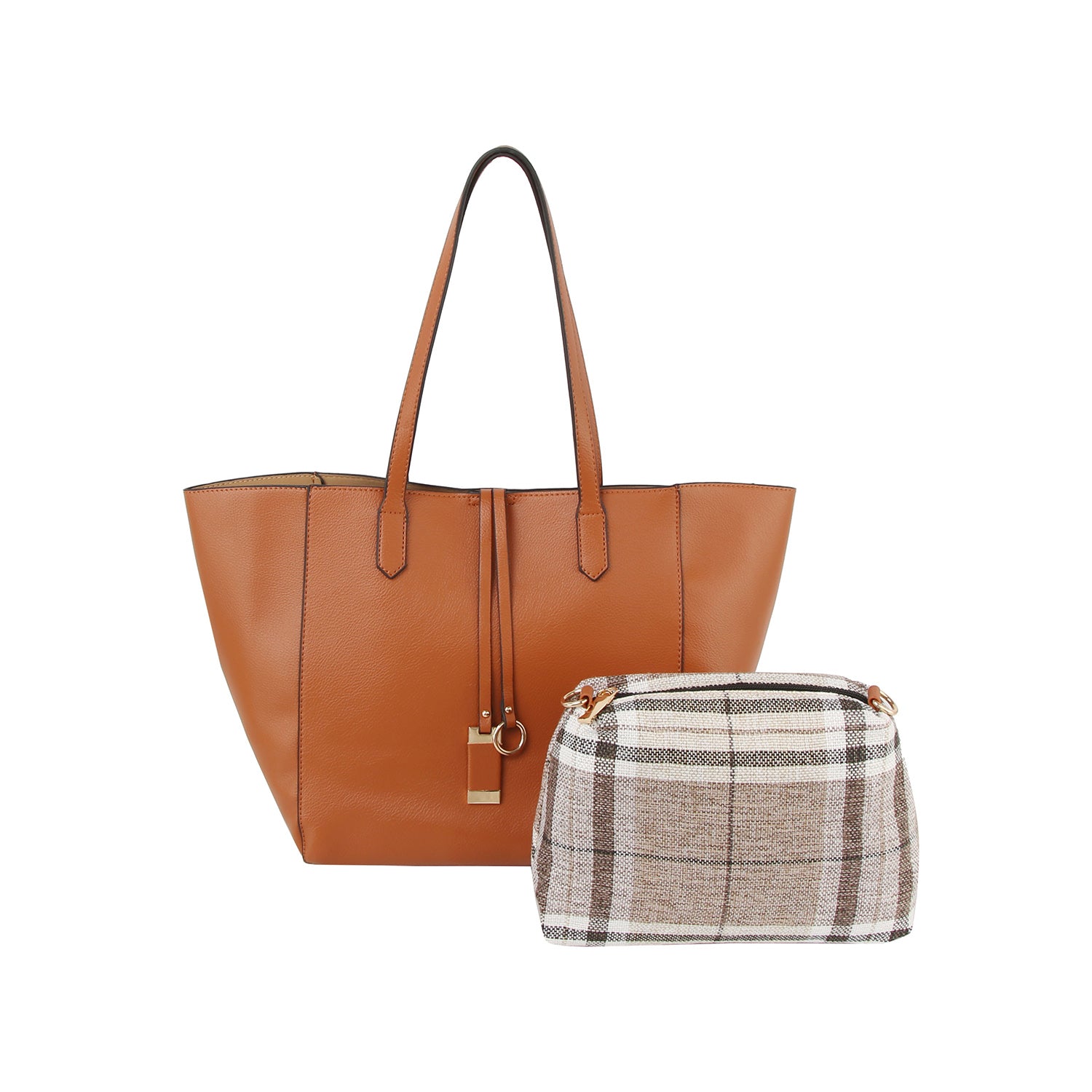 2 In 1 Classic Faux Leather And Plaid Tote Set