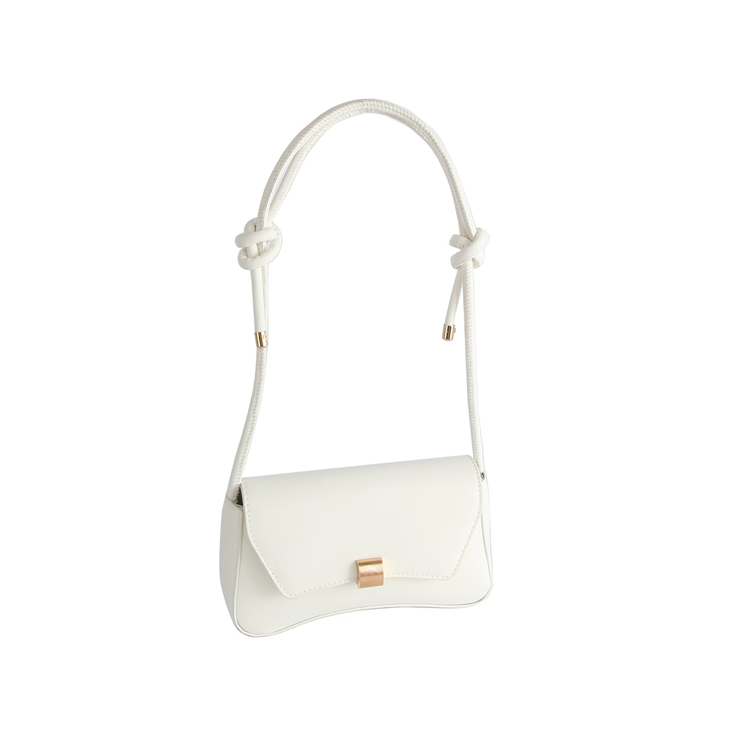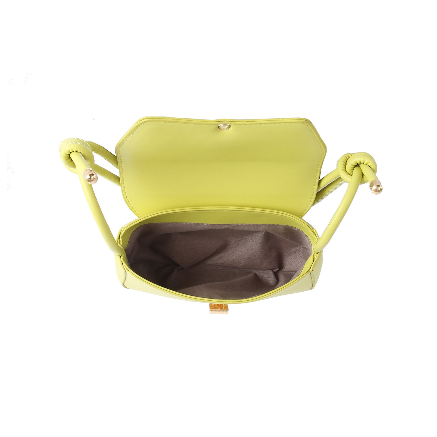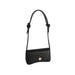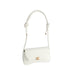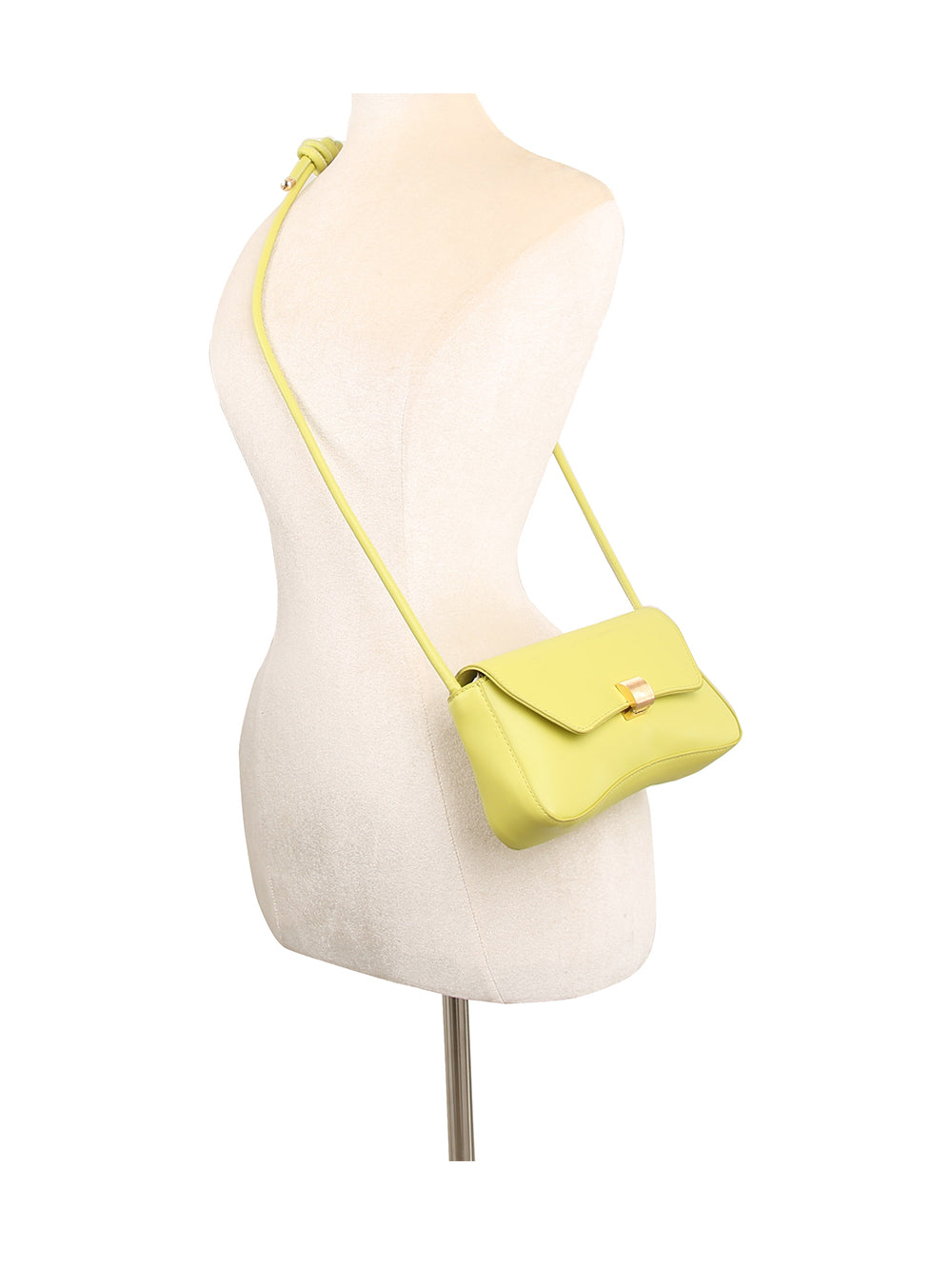 Single strap. Faux leather with lined interior. Top flap closure. Gold toned hardware.  Approximate Size: 8.5L...