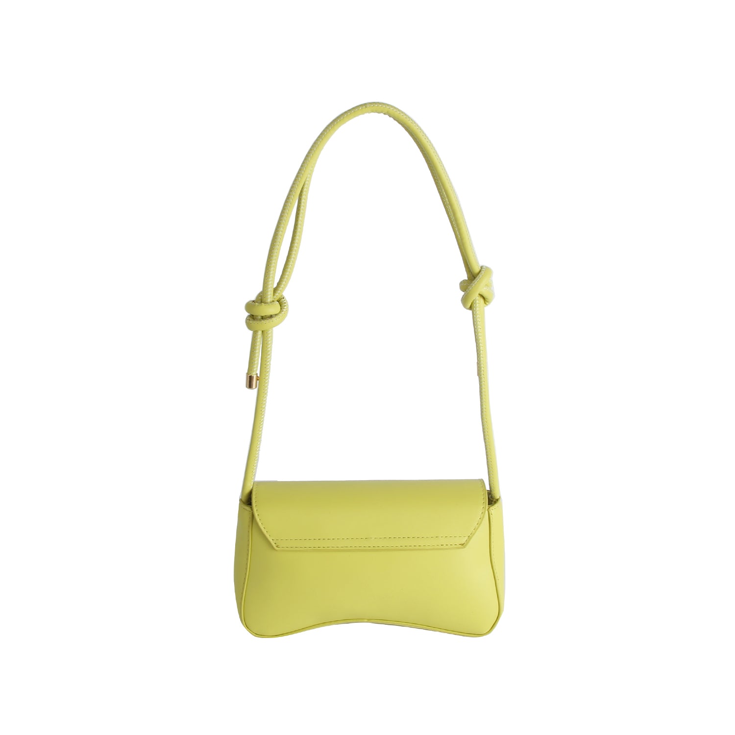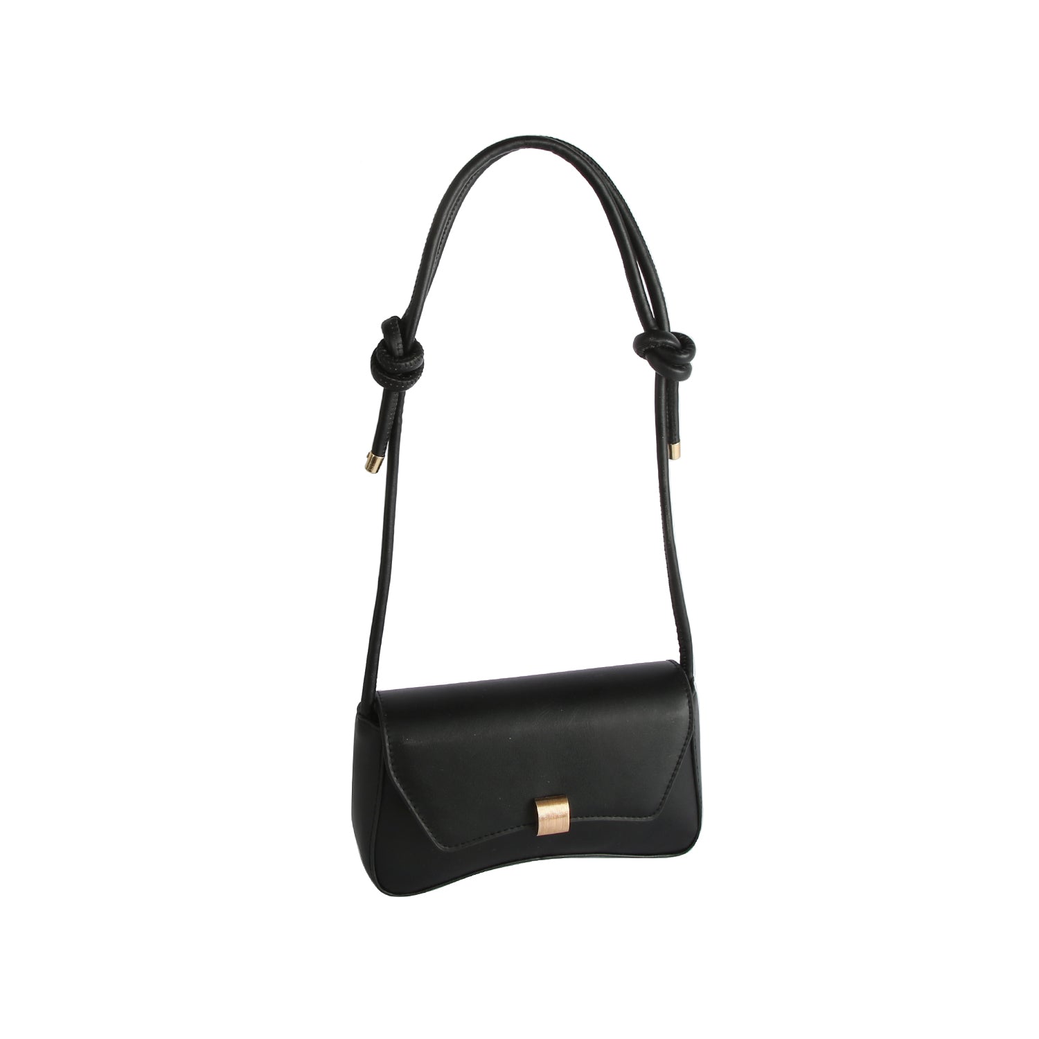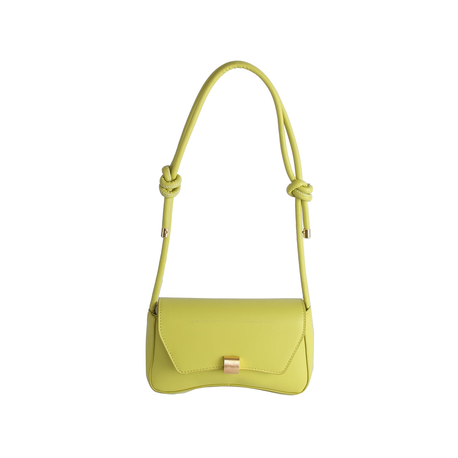 Single strap. Faux leather with lined interior. Top flap closure. Gold toned hardware.  Approximate Size: 8.5L...