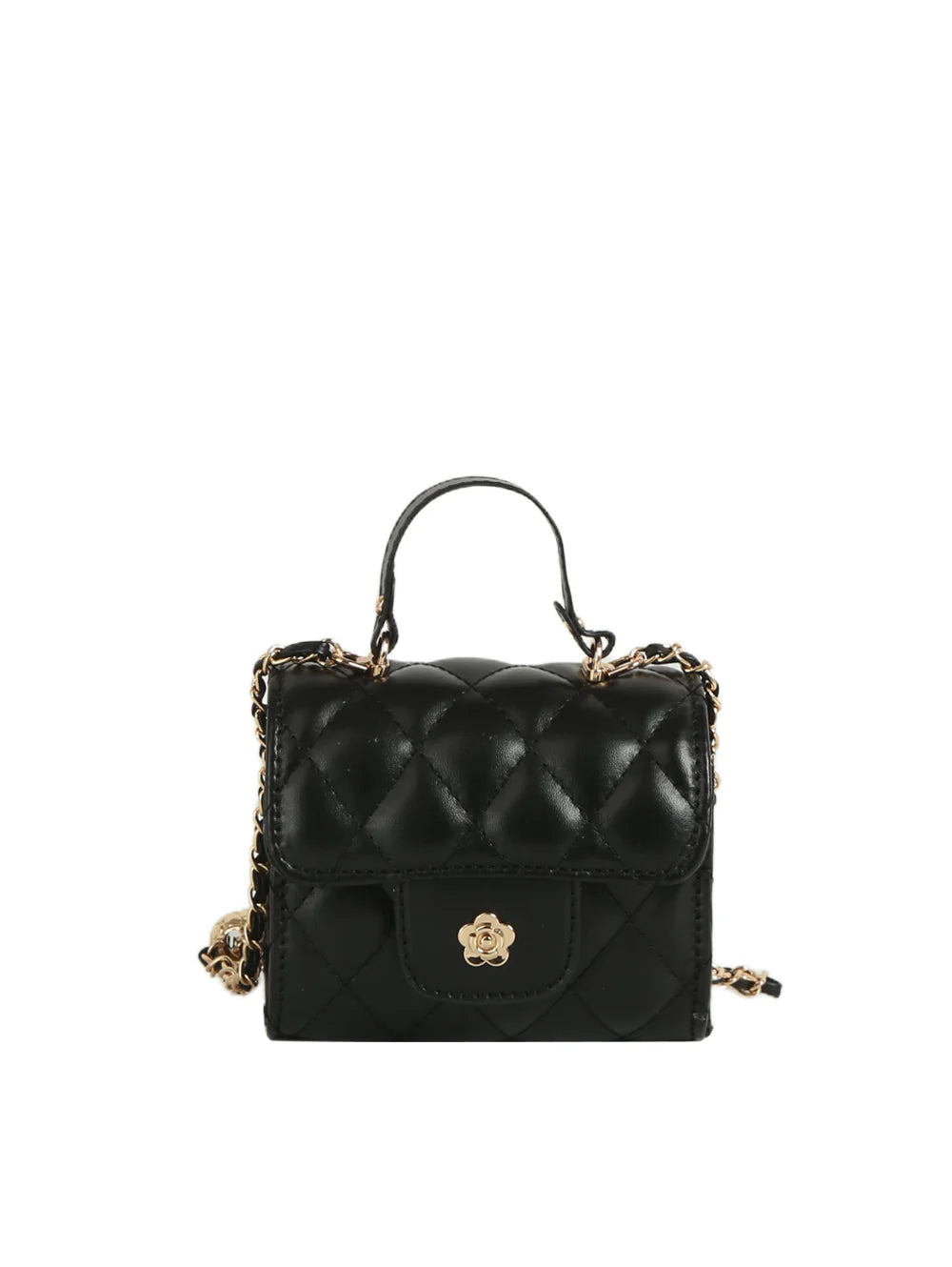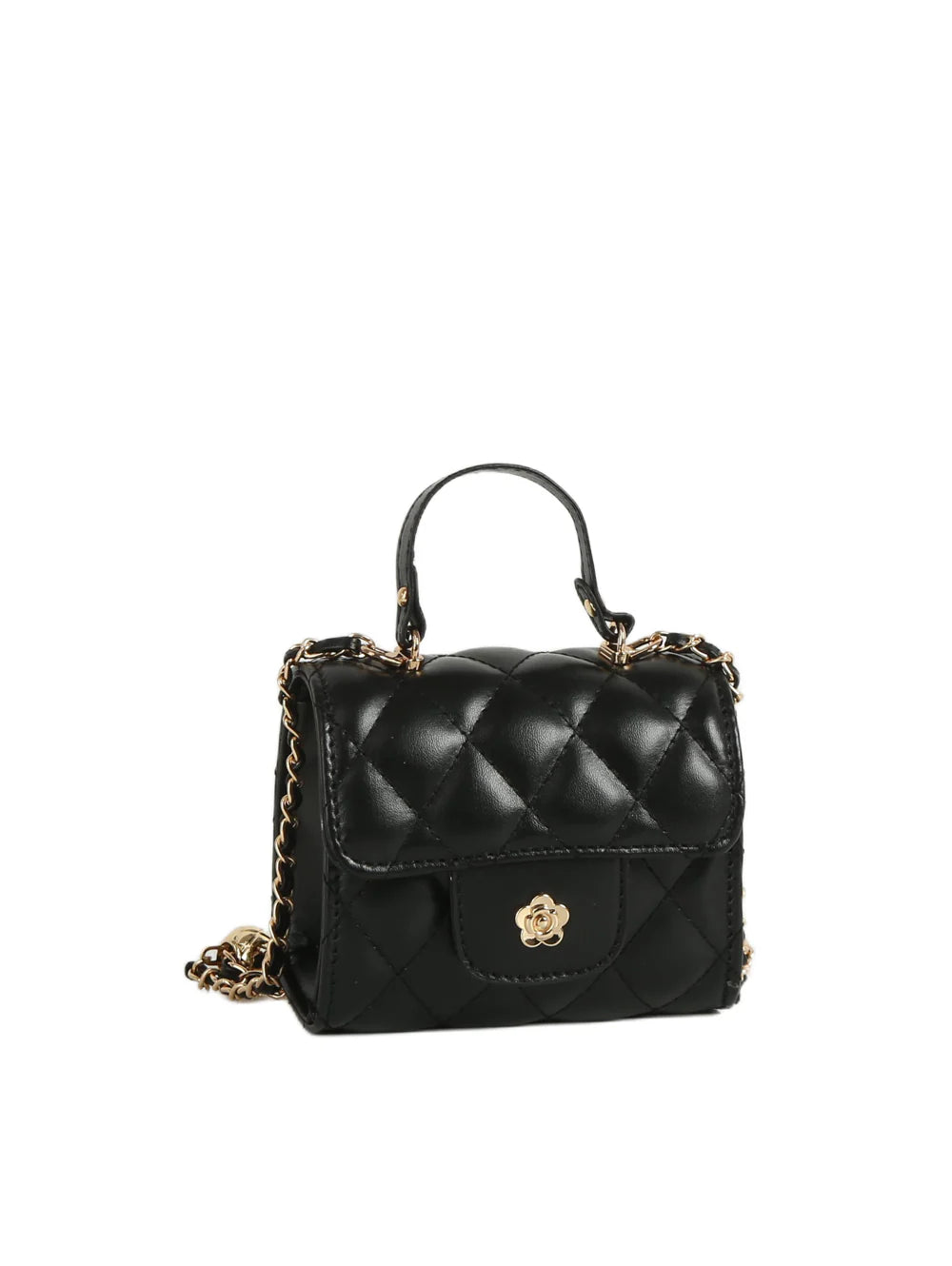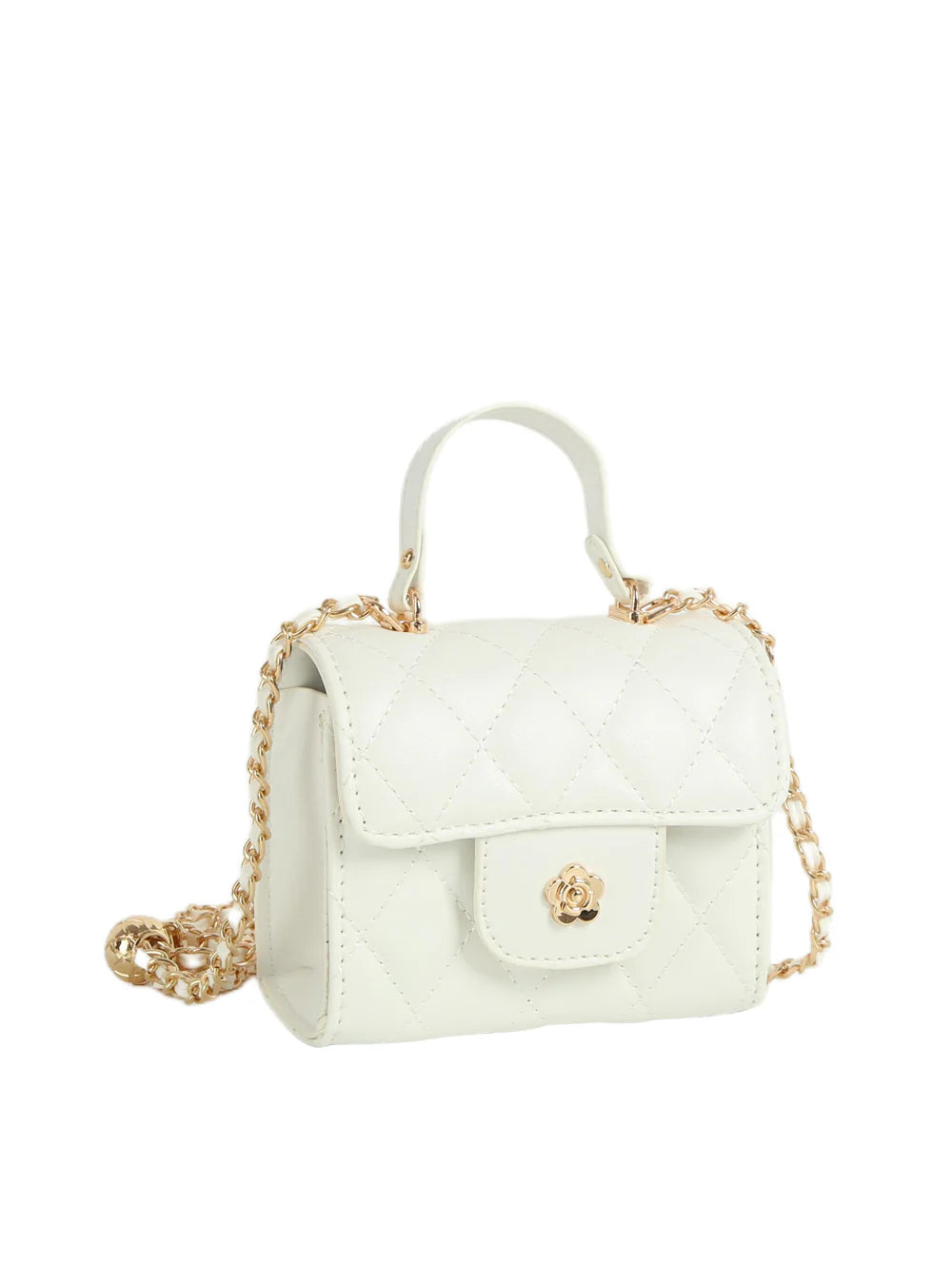 Chain, single strap. Faux leather with lined interior. Top zip closure. Gold toned hardware.  Approximate Size: 4L...