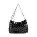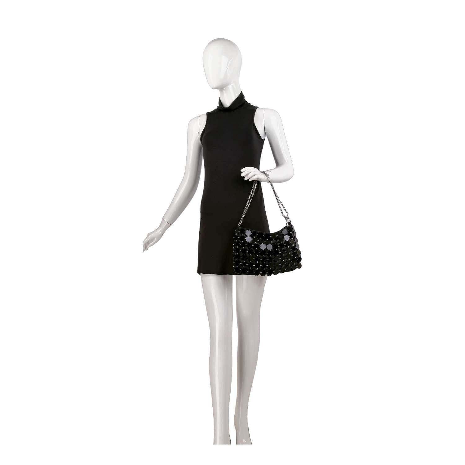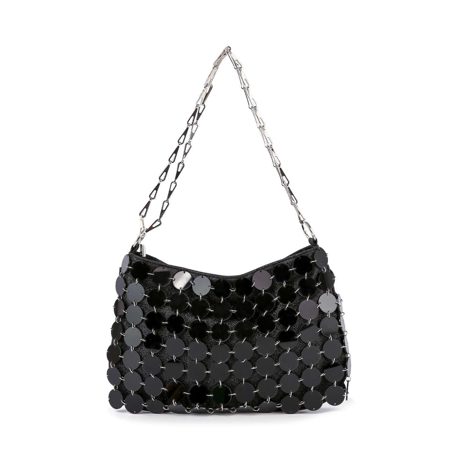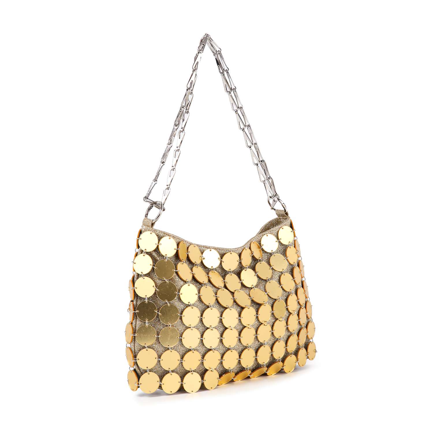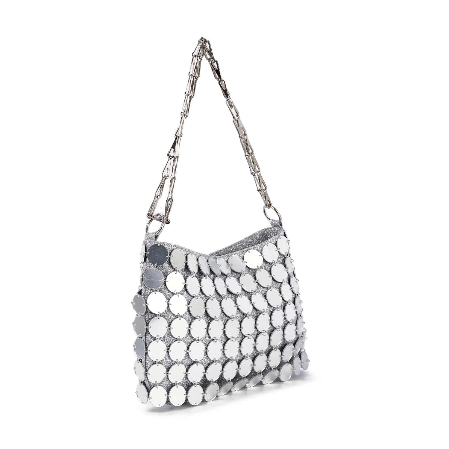 Rows of metal mesh discs add shining dimension to a sparkly evening bag that opens to reveal just the essentials .