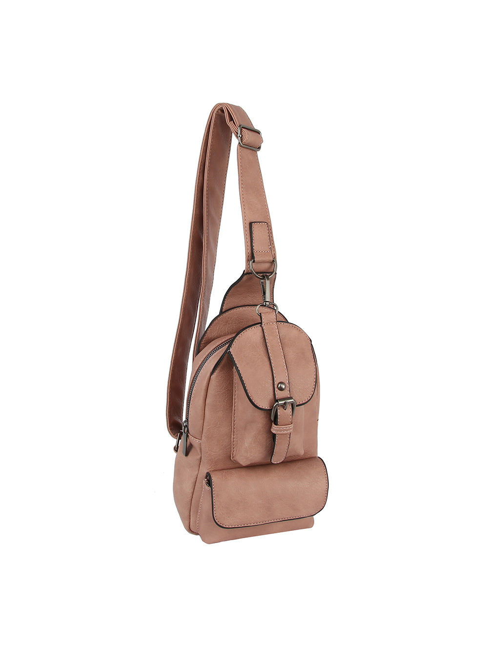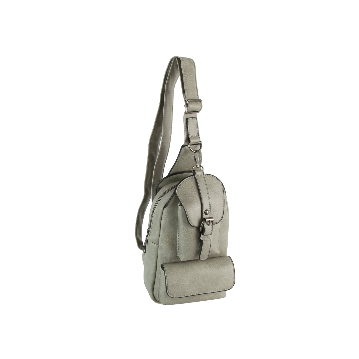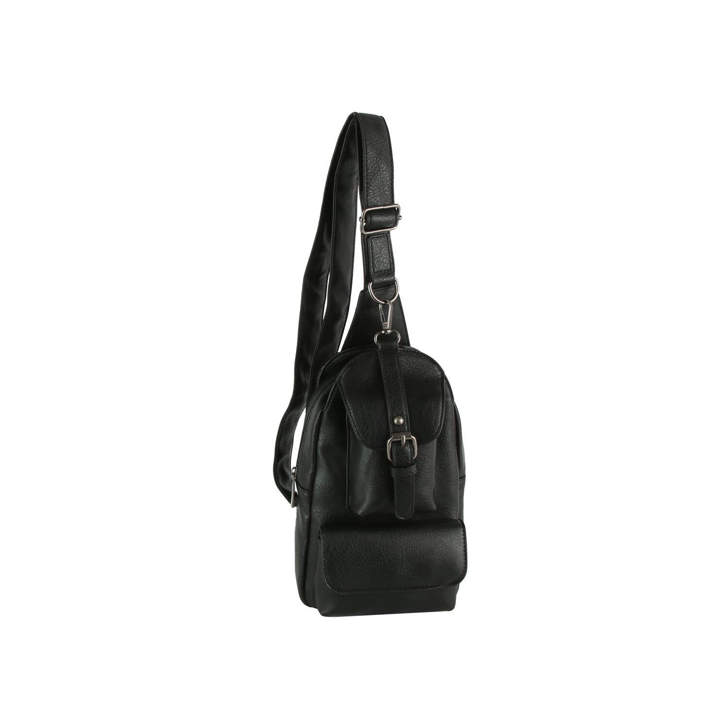 Sleek faux leather design with front buckle flap detail Adjustable crossbody strap for hands-free wear Multiple zip...