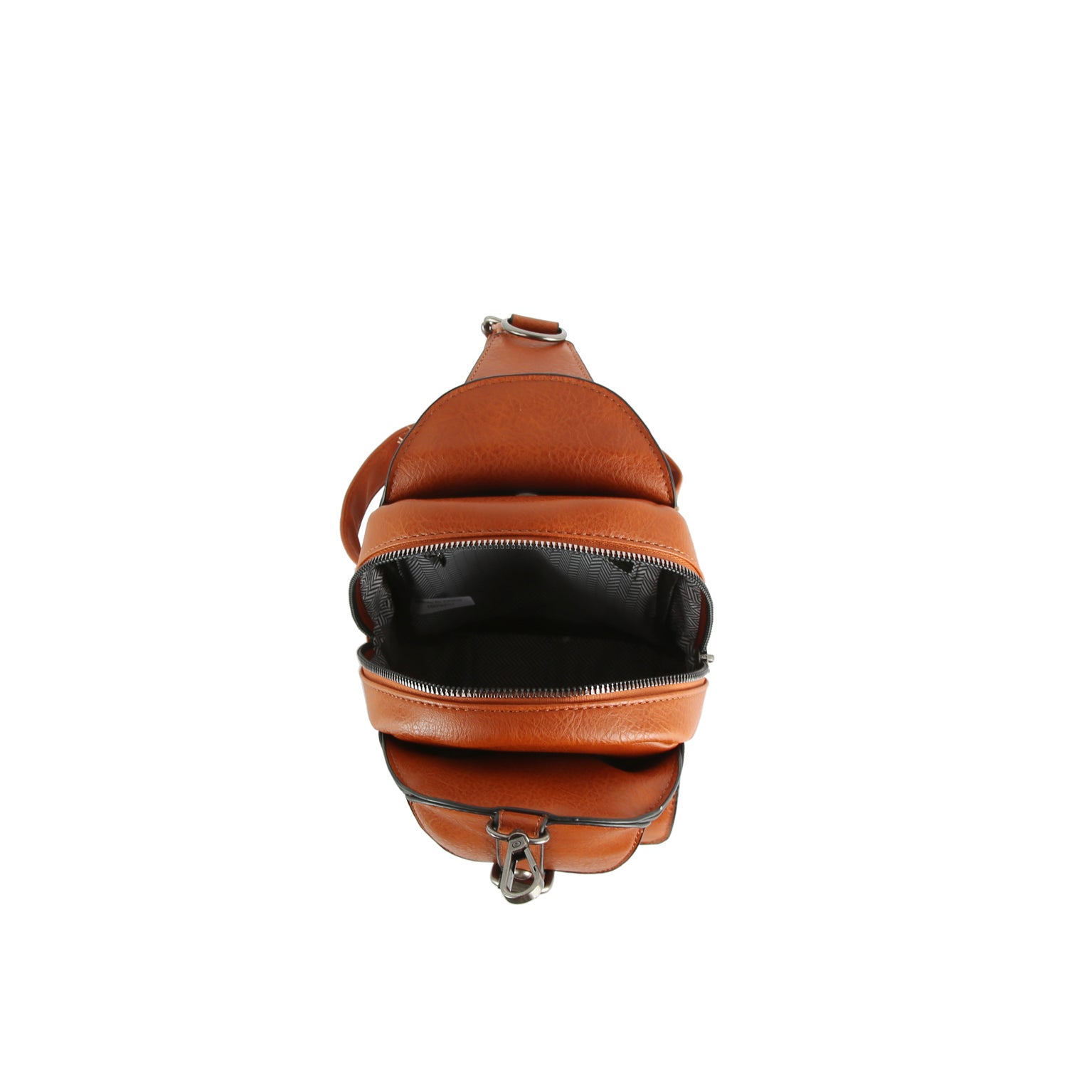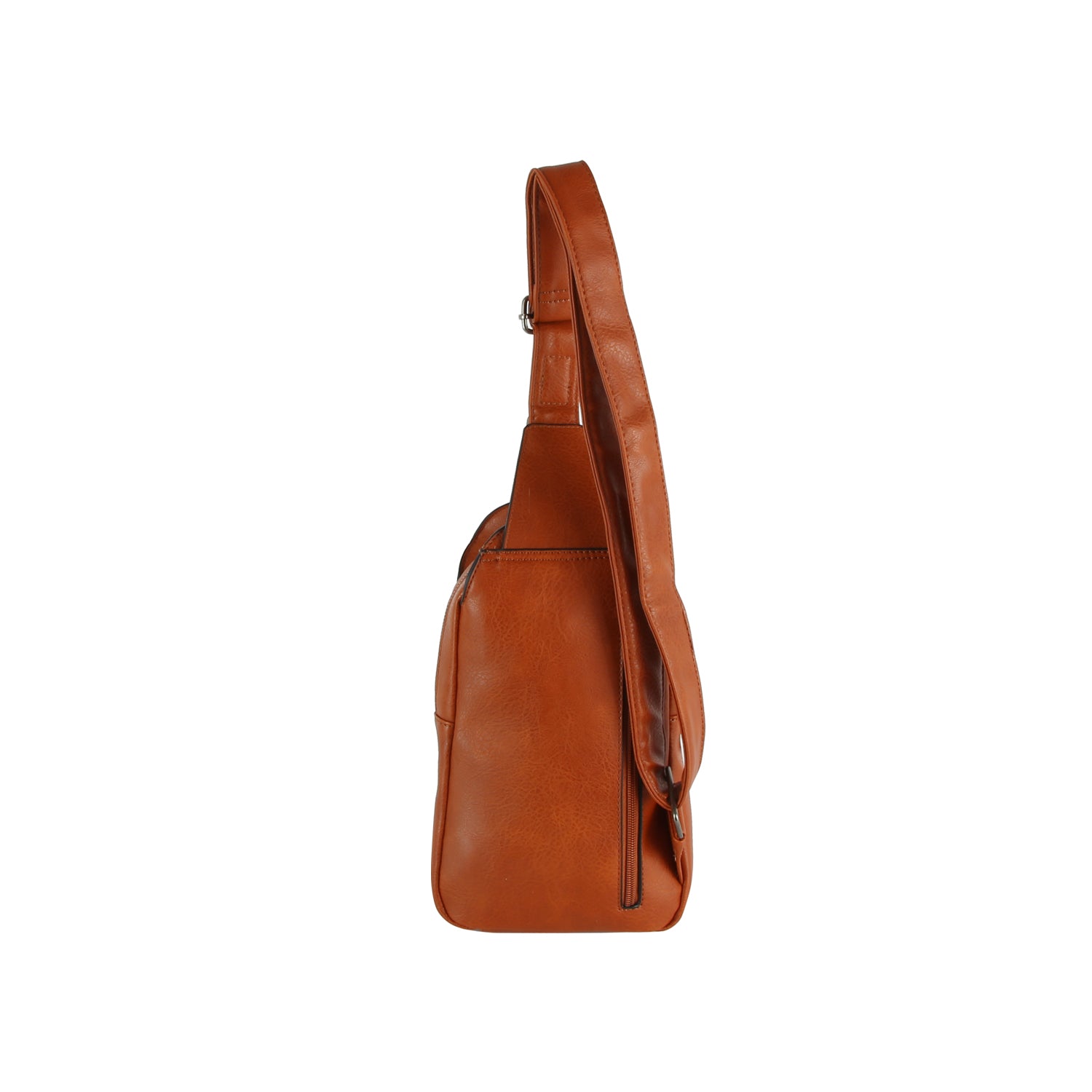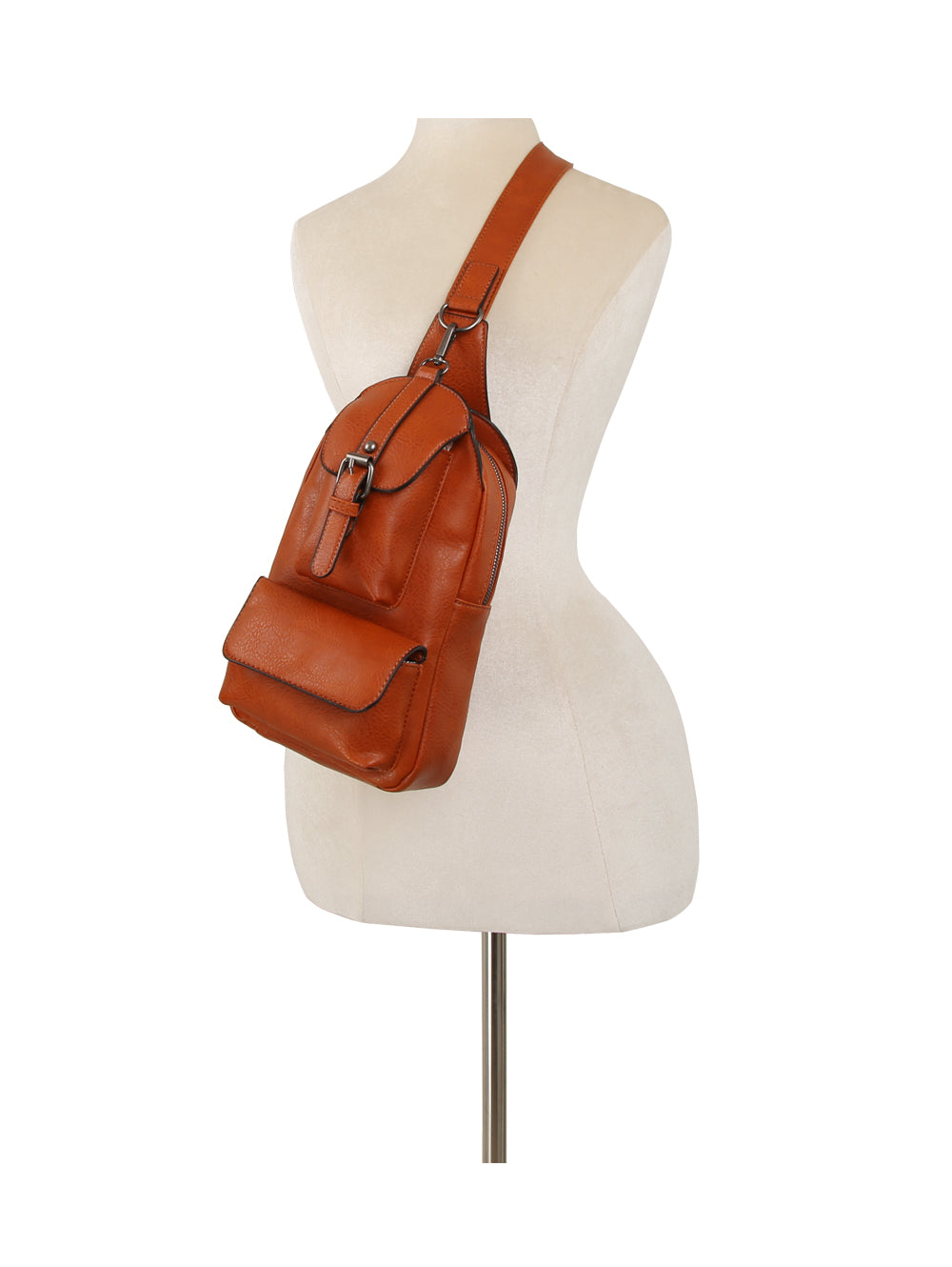 Sleek faux leather design with front buckle flap detail Adjustable crossbody strap for hands-free wear Multiple zip...